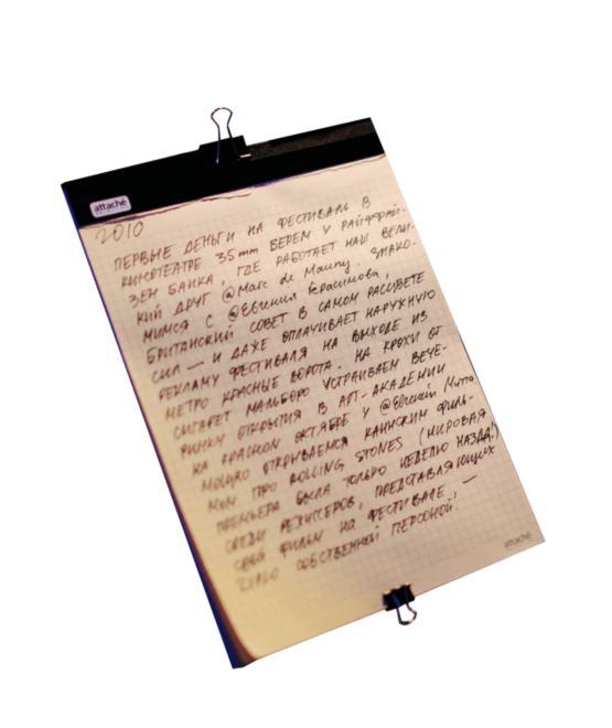 Особенными были и эмоции. Не верилось, что мы отмечаем десятилетие, все было немного как во сне. Приходили люди, дарили цветы, говорили важные слова. Потом отходили к настенной инсталляции с постерами и фотографиями с фестивальных показов и вечеринок разных лет, находили там себя, весело жестикулировали и подзывали знакомых.